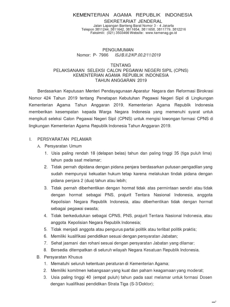 Pengumuman Hasil Seleksi Administrasi Calon Pegawai Negeri Sipil CPNS Kementerian Agama Republik Indonesia Tahun Anggaran 2019 000 KB 340 downloads Download Pelaksanaan Verifikasi Bagi Pelamar Penyandang Disabilitas Dalam Pelaksanaan Seleksi Calon Pegawai Negeri Sipil CPNS Kementerian Agama Republik Indonesia Tahun Anggaran 2019 000 KB 24 downloads. Penetapan Formasi CPNS 2021. Kantor Kemenag Bintan Lakukan Pemusnahan. Pengumuman Hasil Akhir Seleksi CPNS Kementerian Agama Formasi Tahun 2019. Untuk Informasi lebih lanjut silahkan kontak Nomor. CPNS di Kemenag termasuk salah satu yang paling banyak pelamarnya mencapai lebih dari 200000 orang. Panduan DRH Pemberkasan Usul Penetapan NIP dan Sanggah. Gurun Aua Kubang Putiah Kec.